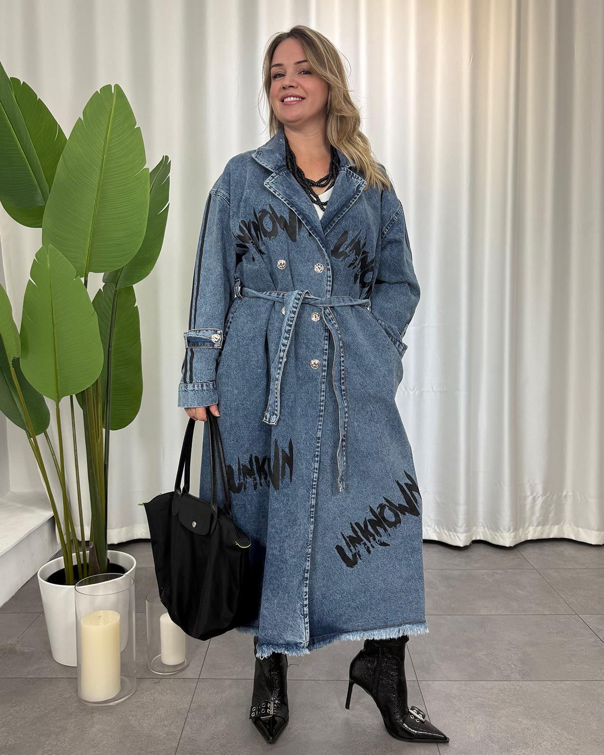 Standartları bedendir. 40-50 beden arası uyumludur. Kot kumaştır. Kuşaklıdır. Uzun kolludur.