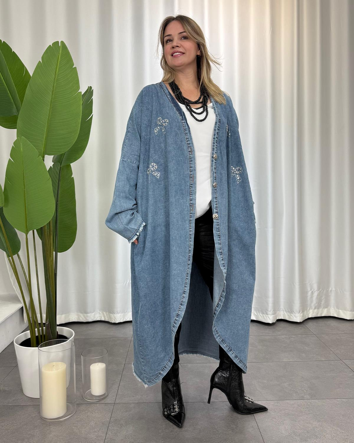 Denim kumaştır. Standart bedendir. 40-52 beden arası uyumludur. Uzun koldur. Ceplidir.